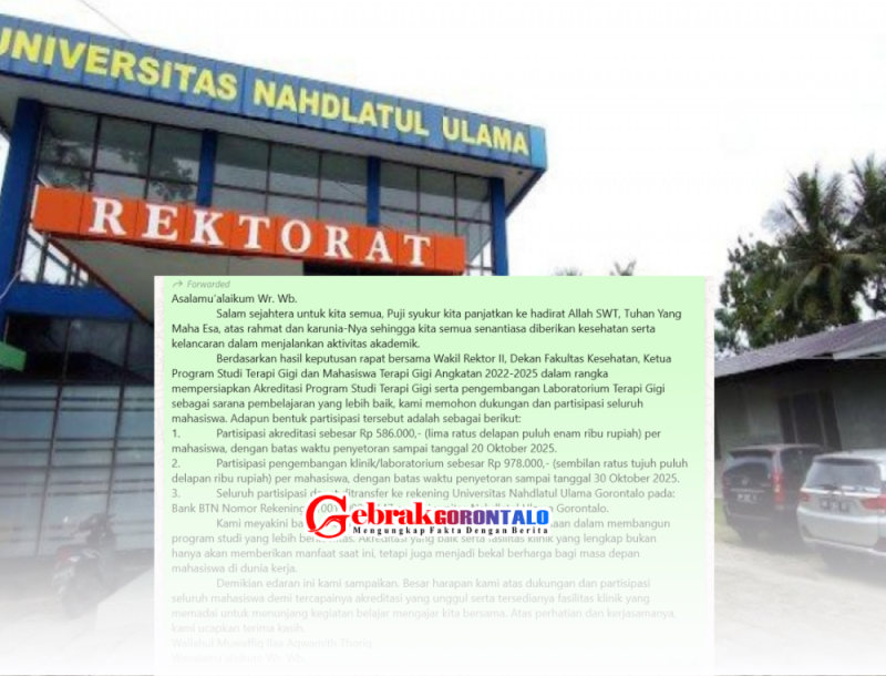 Gebraknews.co.id, Gorontalo – Salah satu kampus Islam di Kota Gorontalo kini tengah diterpa isu serius. Universitas Nahdlatul Ulama (UNU) Gorontalo diduga melakukan pungutan liar berkedok “dana partisipasi” mahasiswa. Surat edaran dalam bentuk pesan whatssapp dari Prodi Terapi Gigi mewajibkan mahasiswanya Angkatan 2022-2025 menyetor total Rp1.564.000 per kepala. Dana ini didesak disinyalir demi mengejar Akreditasi, namun diiringi dengan instruksi rahasia oleh pihak kampus.
